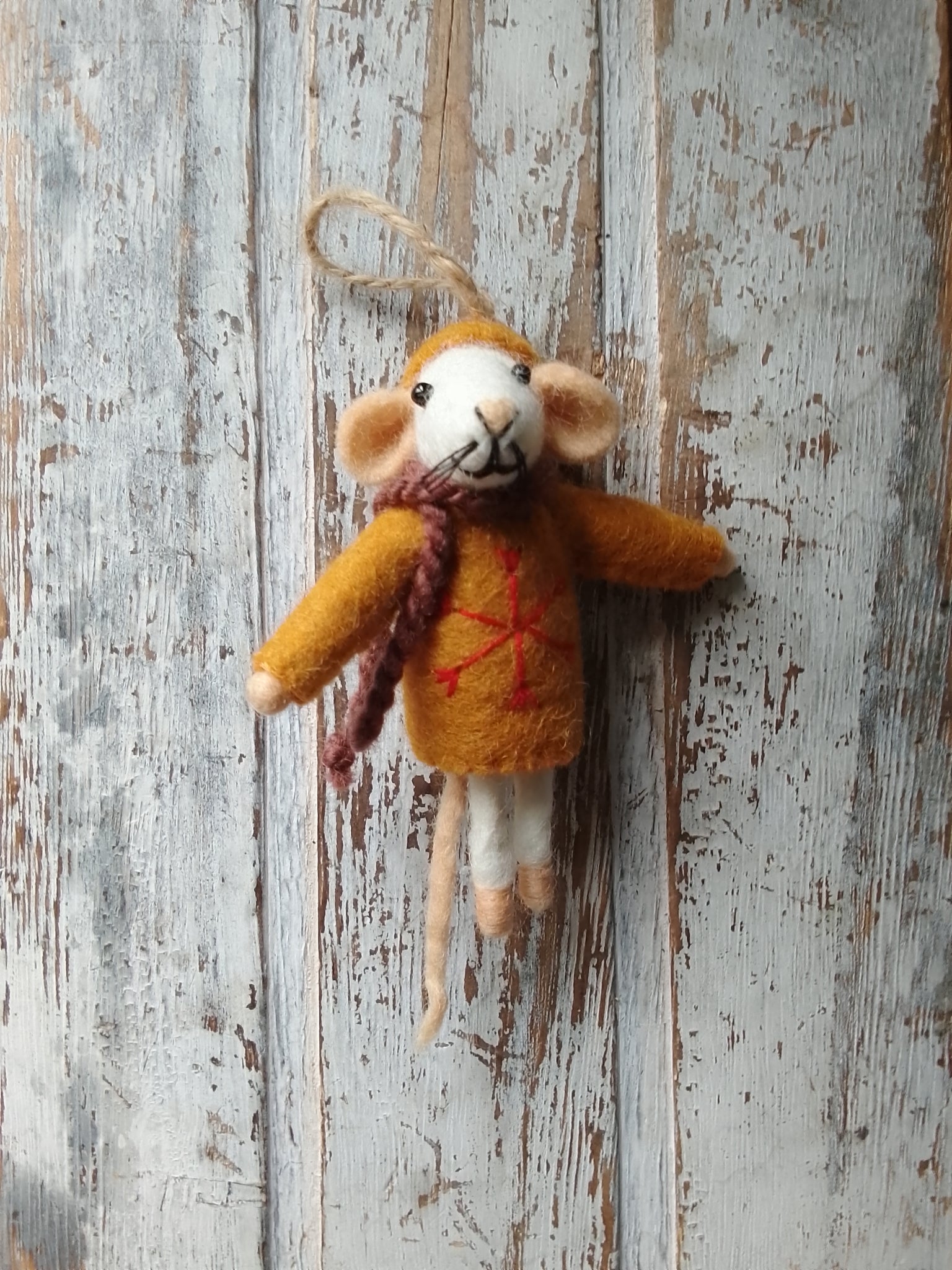 All dressed up for winter in his mustard jumper, hat and scarf, this cute little mouse comes with jute hanger .